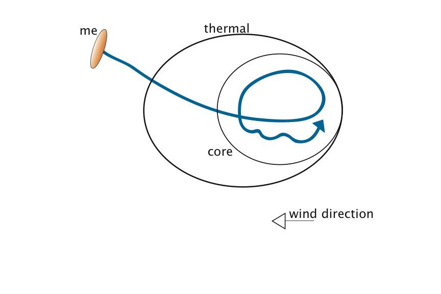 This is exaggerated as well and will always change with the weather. It's an illustration of me entering a thermal, finding the high pressure system at the edge of the thermal, doing two 180 degree turns in the core, then dragging out my upwind leg as much as possible. On the upwind leg I increase brake pressure to a little less than minimum sink and gently shift my body side to side. I have always been told to use linked 360's, but haven't been one to abide by that.