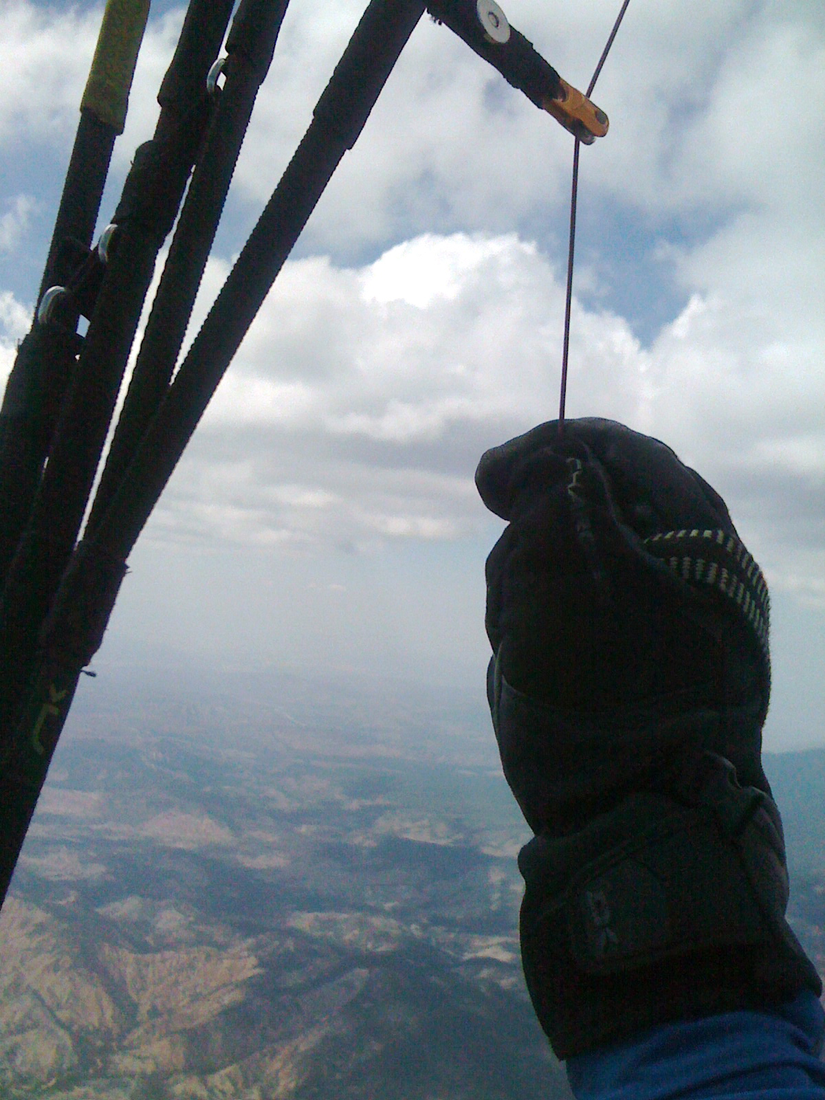 It was a good day but not easy in that we were not getting high above launch...Marge and I both got to 10k at one point, myself above the campgrounds drifting up from the knob. however we ended up lower and later went OTB. My preferred route is to head to Guermo Peak from Reyes peak to find the convergence lift. Since it was blowing from straight South, and I did not have the altitude to dive so deep, I peeled off that route and aimed for the Badlands just on the other side of the roads that lead down to the Ranch OTB, on a line to Pinos. I picked up lift just beyond the Ranch roads, saw clouds forming out West at the beginning of Badlands up from Dry Canyon. Tony and Aaron were in tight circles down lower difting East from that area. I turned toward the forming clouds, climbing ever faster as Aaron and Tony drifted by to the East. Then it was easy pickings for lift across to the 50-50 area and the real cloud development above. Tony flew behind me while Aaron zig zaged out front. I flew the roads into Lockwood Valley, then turned North into the foothills, following Aaron to remain under the clouds, climbed out to cloudbase and escaped cloud suck back to the bluehole South over Lockwood Valley. Could see Tony at cloudbase over the entrance to Lockwood Valley in the middle of a cloudstreet that extended from New Cuyama peak to Pinos Mtn to Fraiser Mtn. Turned to Fraiser coming in from the Northwest. Meet up with Aaron in the usual mixed up lift at the East side of Fraiser. Finally left with 10.6k. Landed across I5, on the road to Quayle Lake in stift South breeze.