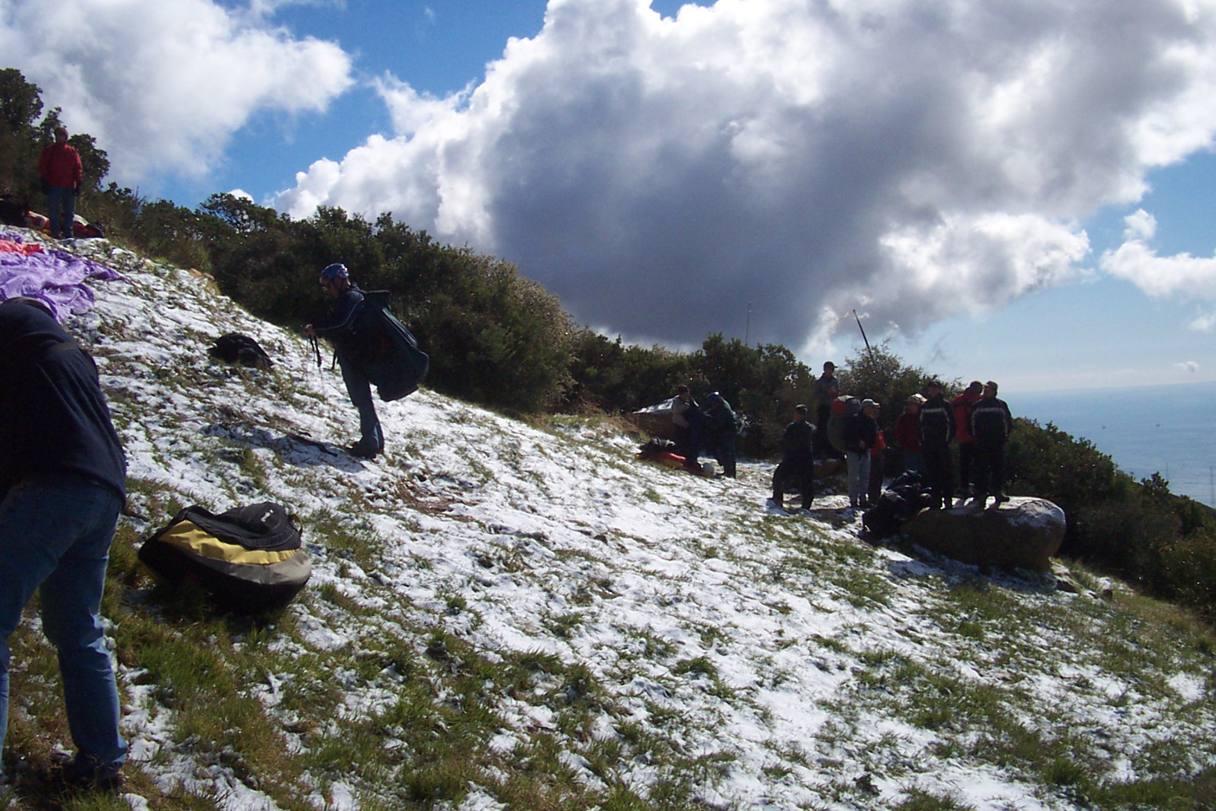 Still in bed when Diablo called at 7:00am to say that it was blue in Santa Barbara. If I had the option I would have waited for Monday for dryer conditions. But since I didn't I was out the door by 7:30 for that piece of Kevin Carter :-) Third HG off around 11:00 (I think). Nothing in the shade at launch and then just a tease above the powerlines at the base of the Factory. Out to the Whitehouse and some sun. Only the sun line was further out past the Rock. Decided to head out to it anyway. Worked some scrappy stuff for a bit, but nothing that seemed like it would get me to cloud base. However, after few 360s I noticed that the Whitehouse spine was back in the sun so I headed back. Worked a snaky thermal to about 3700ft thinking what my next move would be along the way. Montecito just didn't look like it would work so I decided to head out to the sun line that was now all the way out to the 101. At least to Summerland. From there I could see that it angled back to the front points of Polo Ridge and Snowball. Found something above the golf course just short of the freeway and then headed east. I needed to get something else in order to make it to Polo Ridge and found it above the Summerland golf course. Came into the ridge below the top. After 15 minutes or so of up 200ft and down 200ft I noticed some trees shaking out front near the green houses. Headed above them and climbed out to 3k. However, rather than continue on to Snowball I decided to angle out toward Ballaird where a nice cloud was anchored. Of course when I got there it had started to dissipate. Over to Bates, where two PGs were doing some ridge soaring. By the time that I got there one them had decided to go OTB to La Conchita. Well, he was below me so I decided go follow him.