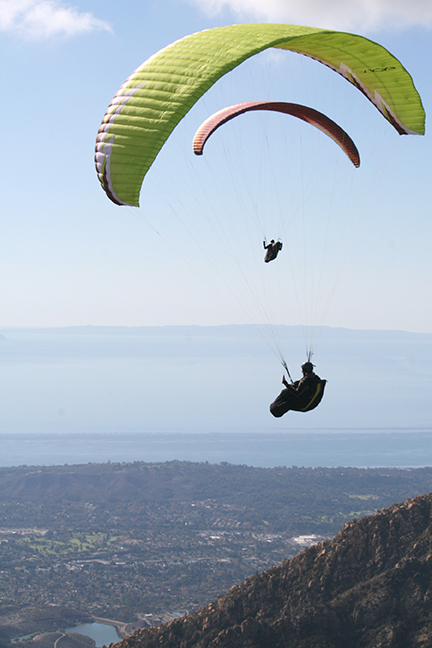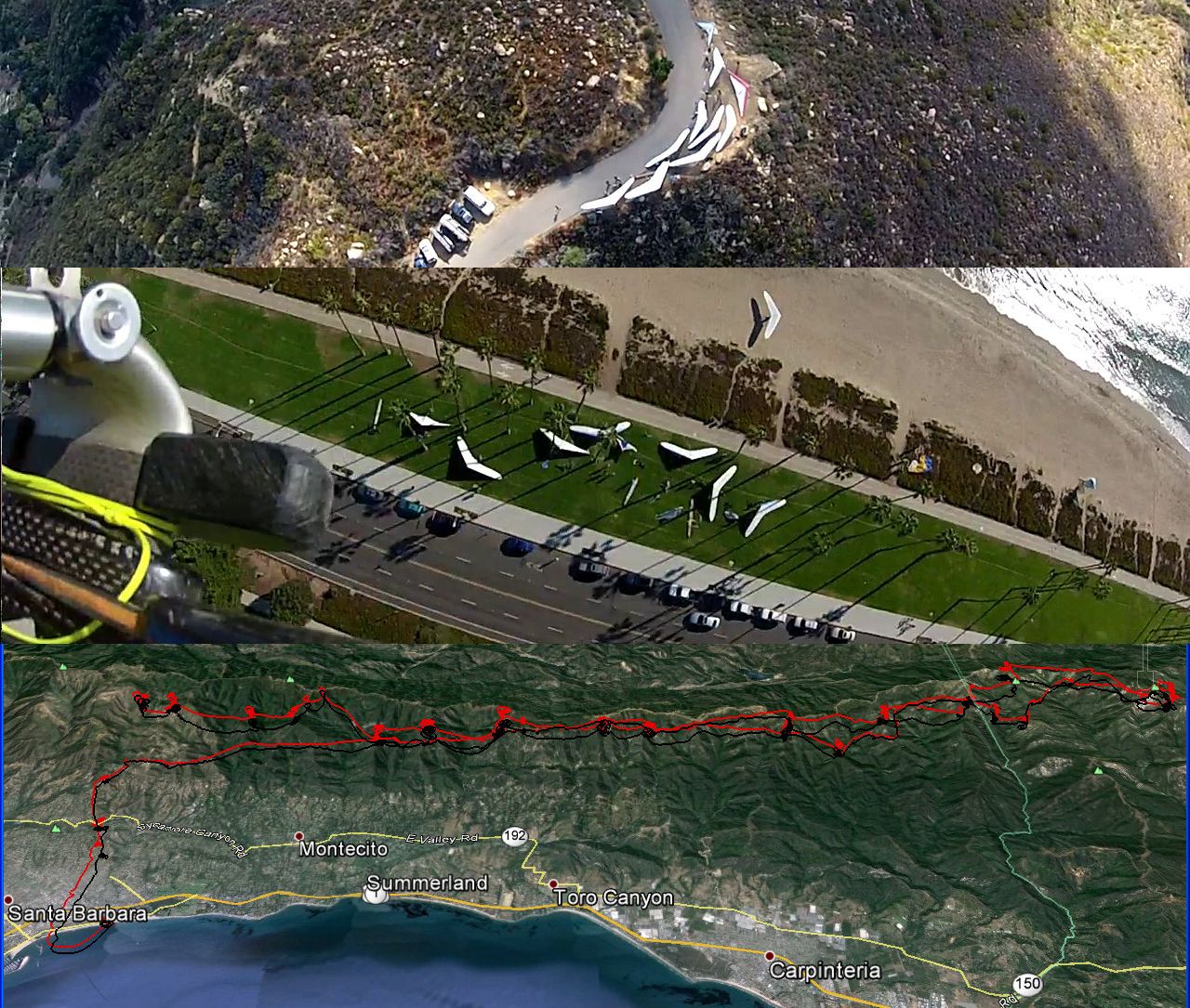 Wow, what a day, paragliders everywhere you looked! Chad pulled up first at EJ, he just went up and over Cathedral. I heard him say something about, 44 hundred, cold, no gloves, on glide to Elingings. It was just to good to follow him, so it was an easy glide to the RnR. Never saw so many gliders climbing over every trigger and so many happy voices anouncing everything from, 44 hundred over blah blah West bound to 49 hundred over blah blah East bound. It was a blast bouncing down range with so many pilots and then taking the easiest glide to the beach at Padaro. Arrived with 22 hundred, cruised around with Magic Mike and enjoyed the spectacular view on one of the clearest days I can remember. The flight ended just as smoothly as it started. I've never seen so many pilots at Padaro, all happy campers on an awesome day! P.S.Thank you Dilly for the retrieve :D .