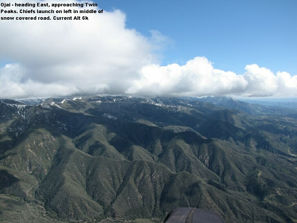 Wow! Let me say it again...Wow!! I think it had to be one of the best days I have ever flown. O.K. get to the flight. Well, I launched just a bit after Tony de Leo, so by the time I got up at Thermal Factory Tony was going through the pass at 4 grand.....rightttttt. O.K. so I'm a bit challenged. Anyway, was with a group of a couple paragliders at Montecito Peak and I mucked up a thermal, got low and they were gone. But don't worry, more PG's a coming and they did. I saw a couple get REAL low at Montecito but they got up and we hooked up and I was leading them until we got a couple peaks past Castle. The lift was still good but cloudbase was low, too low, but this dude and his buddy just kept going.... I don't know how he flies carrying around such giant cast iron balls but I didn't want to go there. It could be just an area of no lift and I'd be in the worst place ever. I don't think my tree cutting blade could cut through that forest.