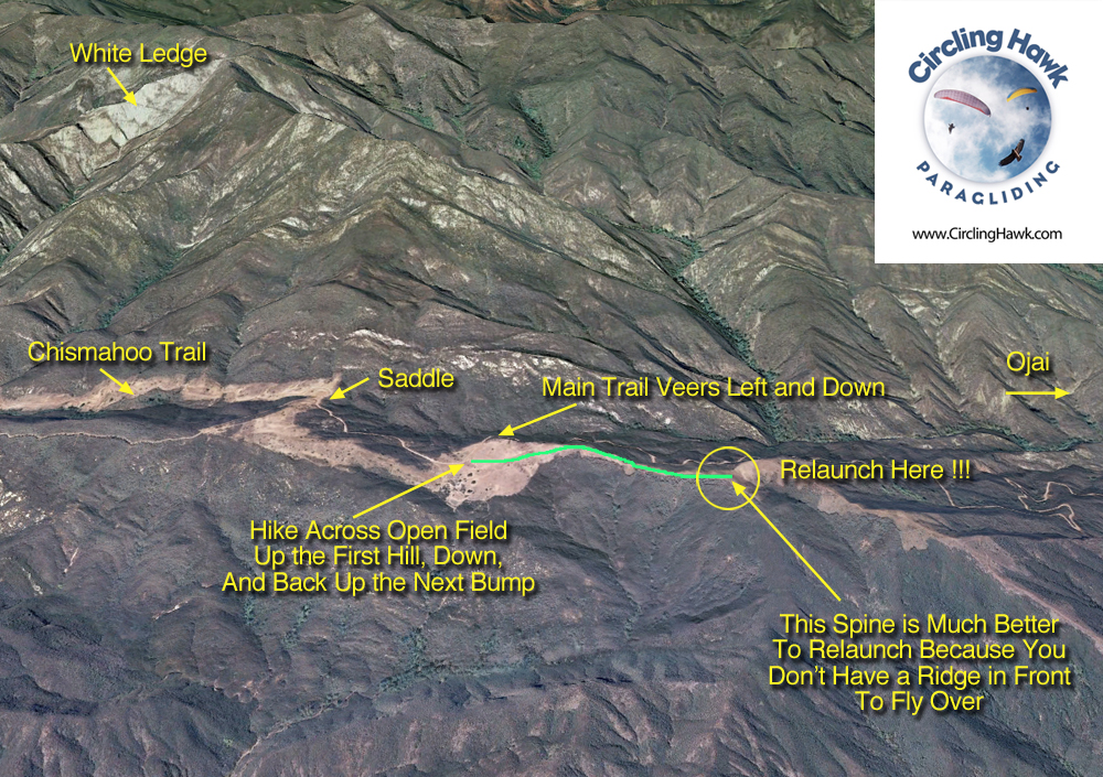 One minor comment regarding nomenclature. My information indicates that Chismahoo is the mountain (or large foothill) in front of East Divide Spine. Several pilots have attempted to re-launch from Chismahoo, but I don’t recall anyone being successful. The ridge described in the graphics you produced is listed as Superior Fuelbreak on the USGS Maps. To avoid confusion, I renamed your files White Ledge Re-Launch and posted them with our other resources at: