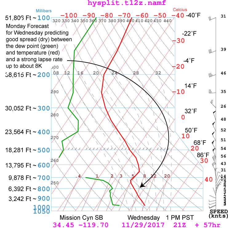 On Tuesday, Ojai offers a better lapse rate than SB, up to about 5K. SB’s lapse rate is weaker, but not inverted. The wind backs off enough that I suspect SB will work good enough that it isn’t worth the cost of trekking to Ojai