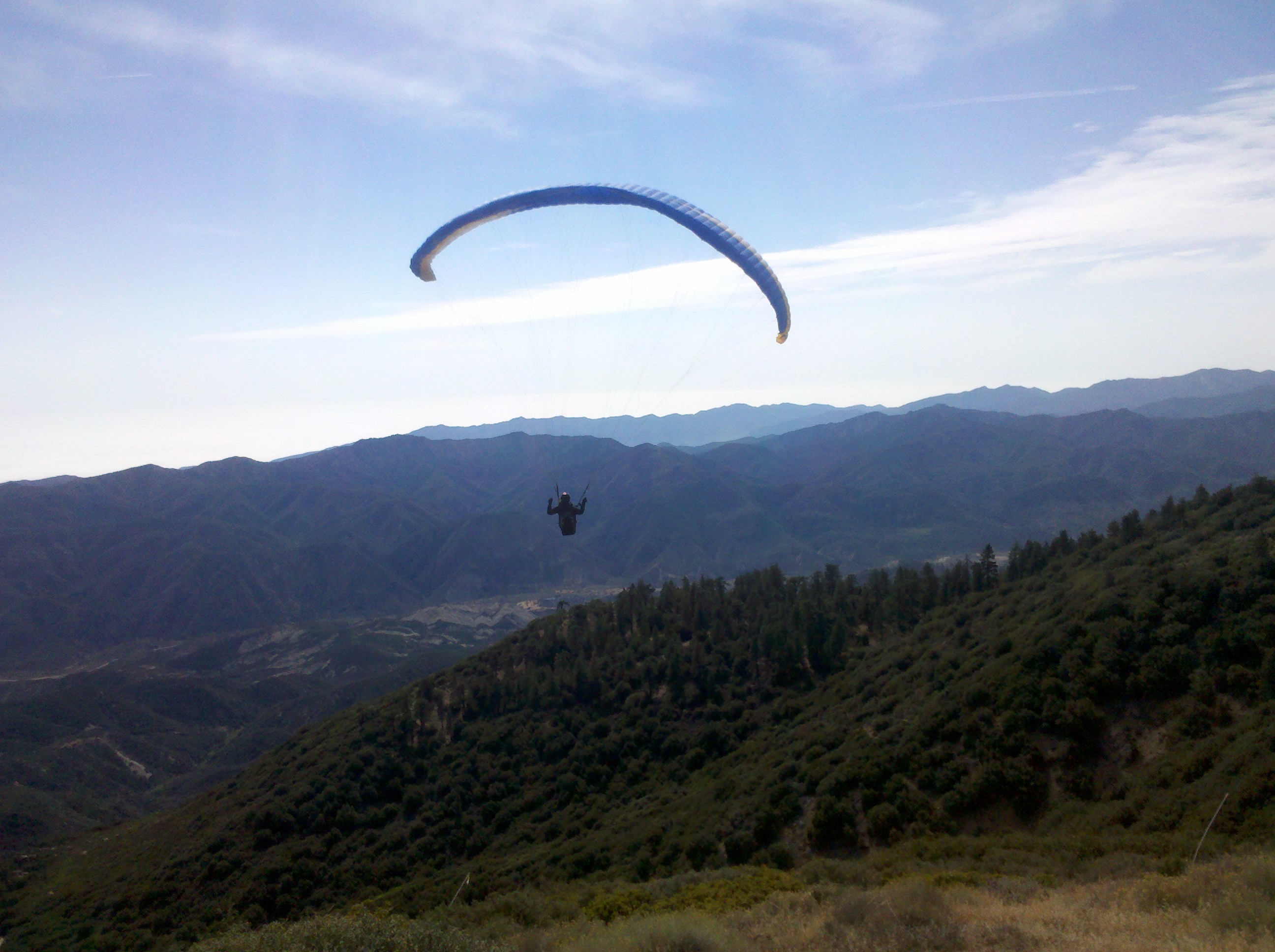 Well, I FINALLY made it into Lockwood Valley!!! I launched after Zippy and found lift right away that took me to 10K. I then boated up and down the range between 9K and 11K. Reliable lift was always over launch/knob, so I kept going back there to tank up. I hit 12.7K in one of those tank ups. I went OTB at 11.7K and headed straight toward Lockwood Valley because there was a big cloud in that direction. I could see rain on the northwest side of LV. Terry Taggert was scratching over the badlands and DD had landed at Dry Canyon. I was down to 7500 and was thinking about heading back to Dry Canyon, when I started getting lift over a big hill north of LV road and west of the badlands. I rode that to 10.2K and then told Kathleen that I'm going to make it into LV. I stated heading SE to get away from the rain and it started hailing pea sized ice balls on me. I'm heading toward the foothills to the south of LV, but they are all in the shade and I get nothing. I'm down to 7000 and made a bee line toward the airport. I get there with enough altitude to do a few circles in an attempt to find the wind direction - it was N NW. It seemed like there was no wind on final and at the last minute, I remembered that the ground is 5100 feet, so I threw the bar out way earlier than normal and landed nicely. I should have landed closer to the road, but that never entered my mind - long walk, but nice and flat. Terry landed on the south side of the road close to the airport. Jonathan landed at Quail Lake, and I don't know where Marge, Bob Anderson, and Zippy landed. It was a fun day. Now I'm gunning for the Antelope Valley.