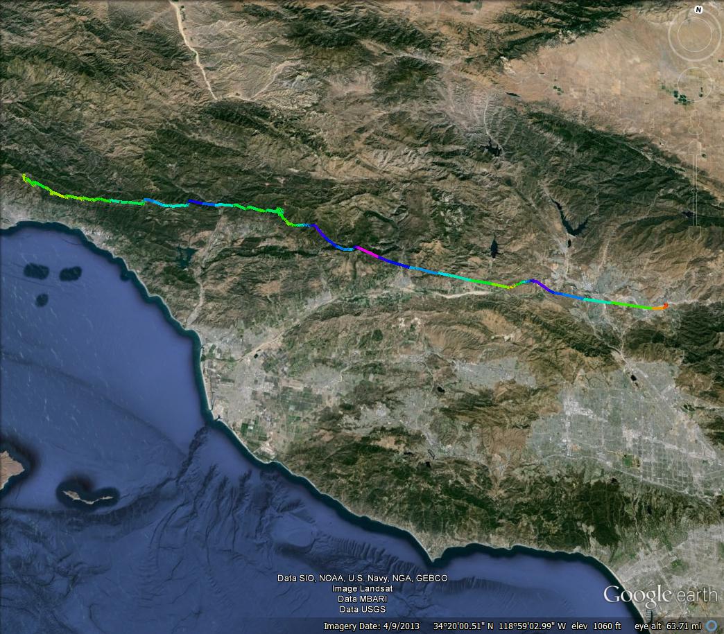 Had a nice flight from EJ Bowl yesterday, landing at Sand Canyon Rd. and the 14 for 73 miles after waiting out the sun line. Low 4s through SB then 7+ just short of the powerlines. Bypassed both Noon and Whiteledge (after tanking up at Divide) heading for Bump 3. Climbed out again to 7k just short of Bump 3 and then basically copped a glide to Three Stooges (stopped at Nordoff for a couple of turns but the air was bit too textured for my blood). Despite the high climbs earlier in the flight I actually almost flushed off of Chief's. A low save from the foothills in front of West Repeater kept me in the ball game. Back to the high 7s over Boyds and then close to 9k over Santa Paula Peak. After a few turns over the foothills just east of Fillmore that didn't amount to much I took my altitude and headed to Piru. Started to pick out landing fields about half way to the 5 from Piru, but I had a nice low save that got me back to the mid 7s. The thermal changed my goal to Sylmar. However, the high peak between Simi Valley and Chatsworth was completely shaded in and 7k ended up not being quite high enough to clear the San Gabriels on a glide. And at the point I had caught up with the shade line so I just veered to the left for a glide to the 14.
