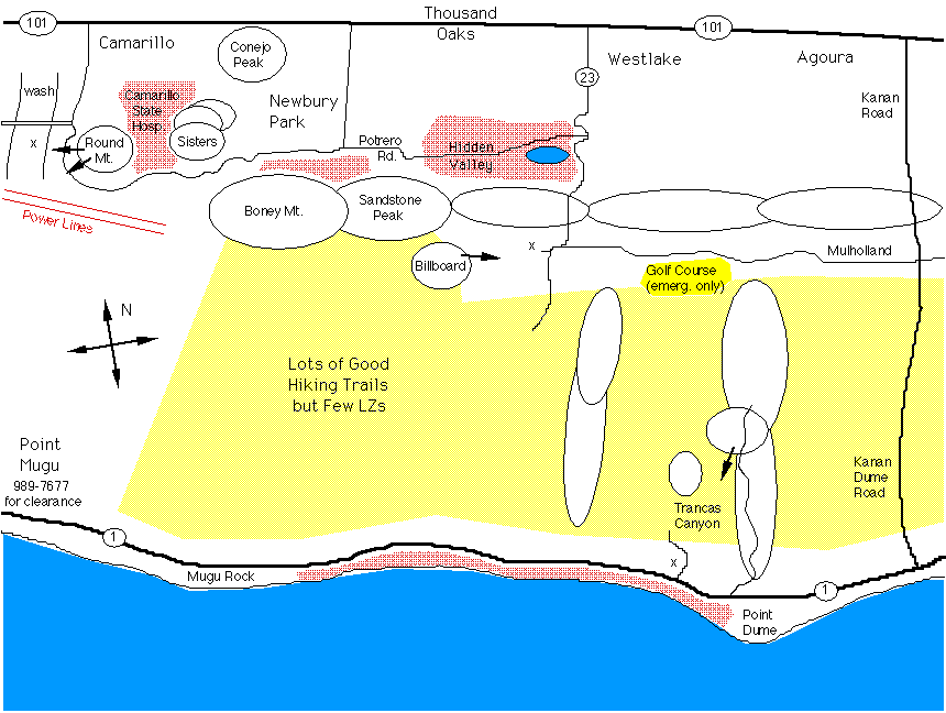 The hill is basically isolated from any other high terrain and has distinct south, west and north faces. Each face is ridge soarable in the appropriate winds, but the face adjacent to any soarable face may become a rotor-sinkhole in ridge soaring conditions. On unstable days, sufficient thermal activity may be present to get up and jump about a mile east into the Santa Monica mountains and head XC from there. Doing so, however, involves crossing over the Camarillo State Hospital (Asylum) which is not a good place to land. Call Camarillo Airport ATIS (805) 484-3351 for current weather conditions.