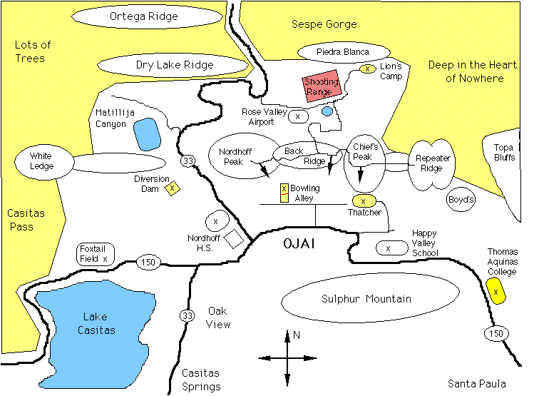 The main LZ for Chief's Peak and the Back Ridge is a large series of grass fields (near but NOT including a soccer field - an easily recognizable green landmark from the air) in Upper Ojai. The ground near the soccer field is flat, but is gently sloped to the east and west. The useable LZ here is enormous and the wind is almost always out of the west - allowing for an easy long landing corridor parallel to the field. The bail-out LZ for Nordhoff is a dirt strip maybe 150 - 200 ft wide but more than a quarter mile long facing southwest away from the mountain. Landing is pretty unrestricted, but there is a power line that crosses the field about a third of the way down its length. The Nordhoff High School LZ is several hundred yards both long and wide, flat and unobstructed - but is bordered by houses, phone/power lines and crowded roads on several sides. These shouldn't present any problem for a Hang II or above pilot, but be aware of them on approach.